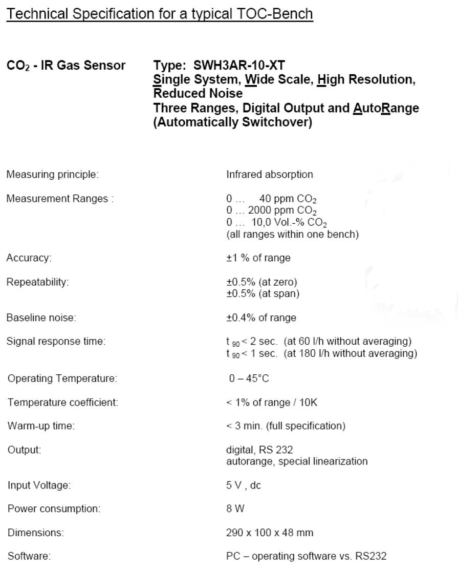 TOC-IR 是應(yīng)用于水中總碳的分析,測(cè)量CO2 濃度可最低到 40ppm,最高可到100%,精度達(dá)到1%,并同時(shí)可實(shí)現(xiàn)多量程功能,自動(dòng)切換以滿足不同測(cè)量精度。其基于NDIR 技術(shù),該模塊設(shè)計(jì)主要用于總碳分析系統(tǒng)。