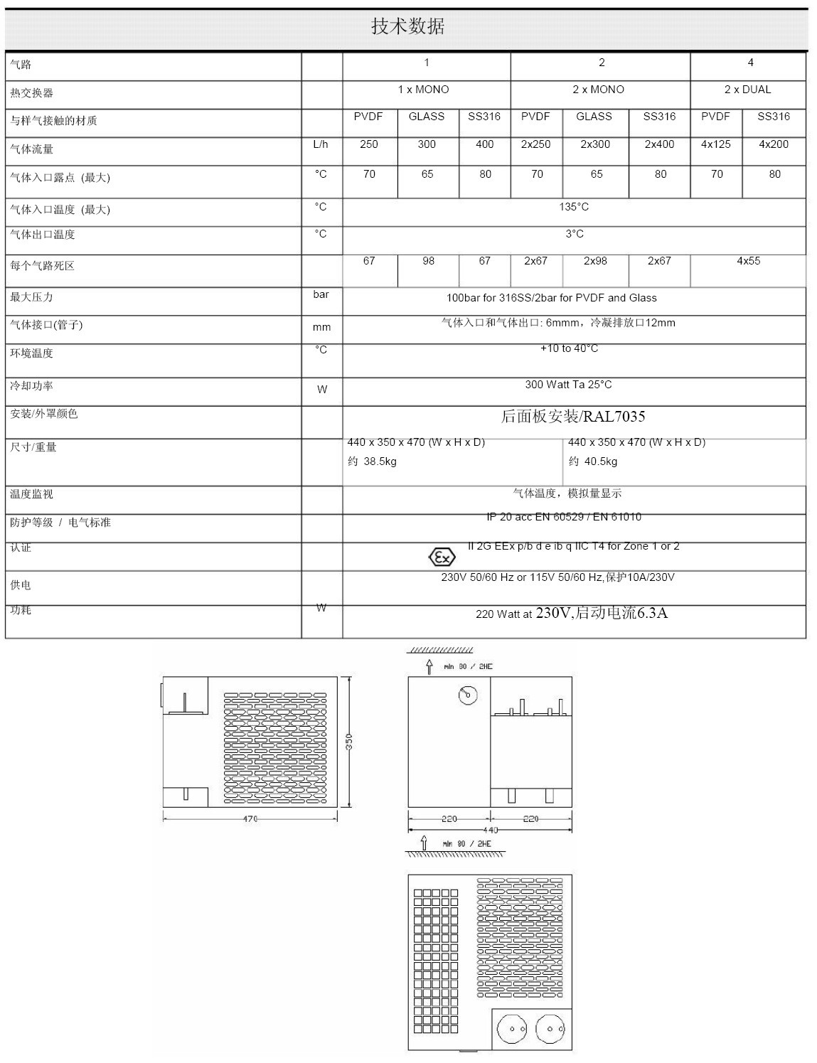 冷卻系統(tǒng)用環(huán)保型物質(zhì)R134a作l冷卻劑。JCT EX防爆型冷凝器的熱交換器可以替換??梢允菃螝饴芬部梢允请p氣路。 材質(zhì)可以選PVDF、1.4571不銹鋼 或杜蘭鈉玻璃。 每路氣體流量最高可達(dá) 400 l/h 。標(biāo)準(zhǔn)顯示模擬溫度。選程故障指示的絕緣端子為可選項(xiàng)。